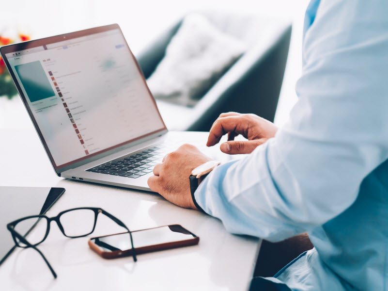 Man wearing longsleeves polo typing on laptop with eyeglasses and mobile beside