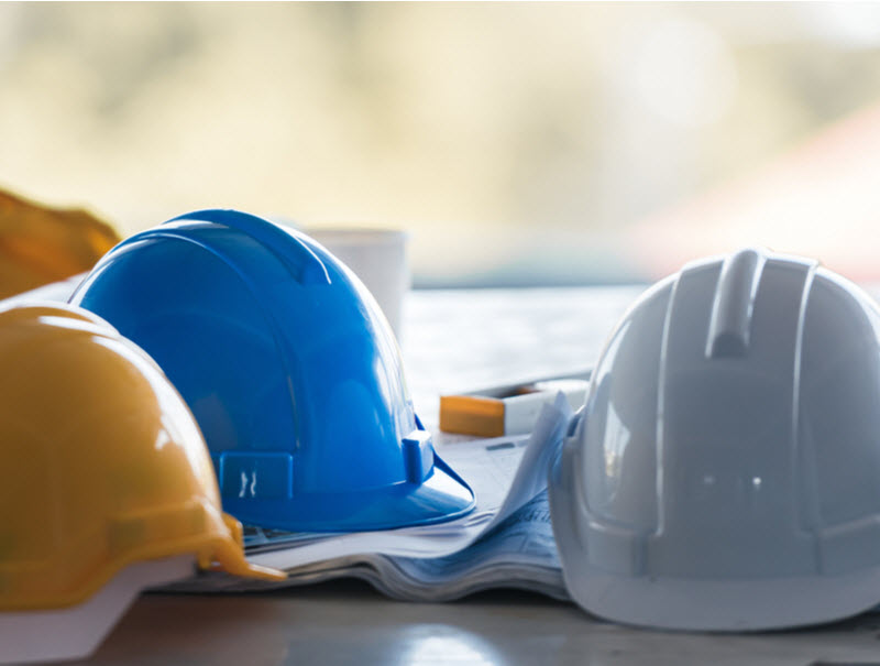 construction safety helmet put on the table with blue print.