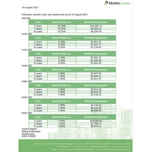 Please see the chart for indicative interest rates and speak to us or directly to Strata Loans for further details.