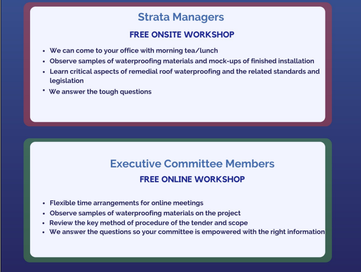 Choose from our free onsite or online workshop options, built to suit the needs of both Strata Managers and Executive Committee Members.